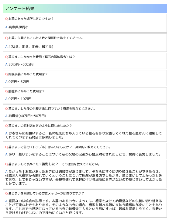 墓じまい経験者のアンケート結果からまとめた例・目安として判断してください。