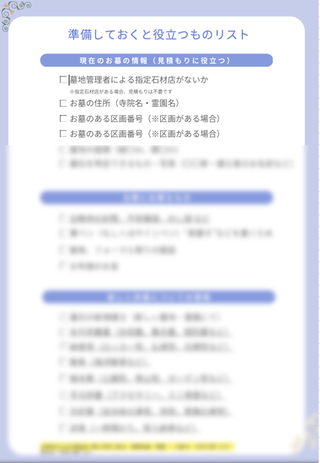 お墓の住所、区画、写真、書類など、見積もり前に準備しておくと役立つものをチェックで整理。